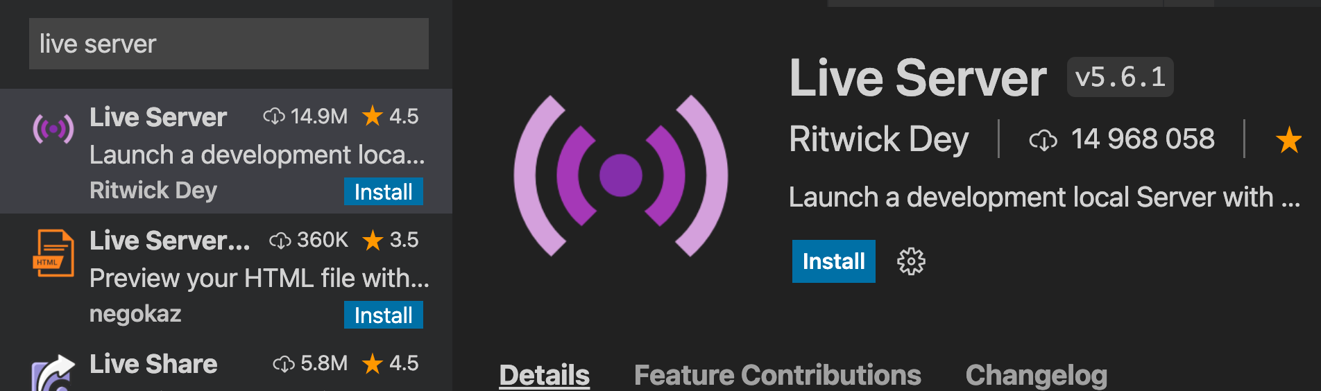 Deretter søker du på "Live Server" og installerer den øverste av søkeresultatene som burde se slik ut: