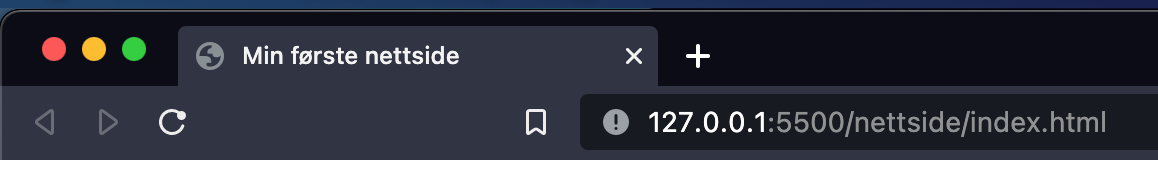 Selv om vi stort sett kommer til å skrive all koden vår i body, så er det enkelt ting vi gjør i head, f.eks. å bestemme teksten som skal stå på fanen til nettsiden i browseren din. Det gjør vi med <title> tag`n. Prøv å endre tittelen på siden din til f.eks. <title> Min første nettside </title> og observer at teksten i fanen endrer seg.